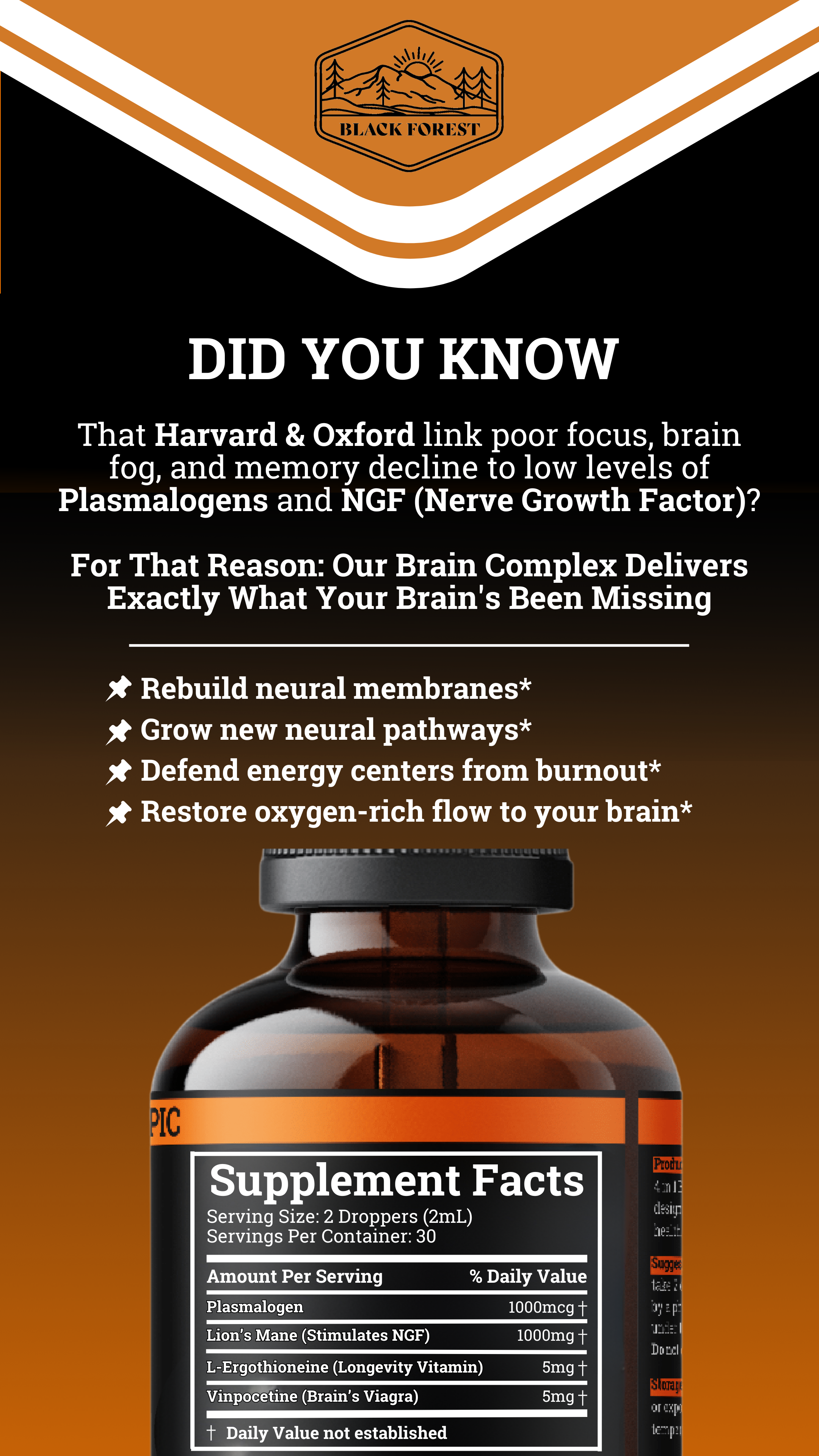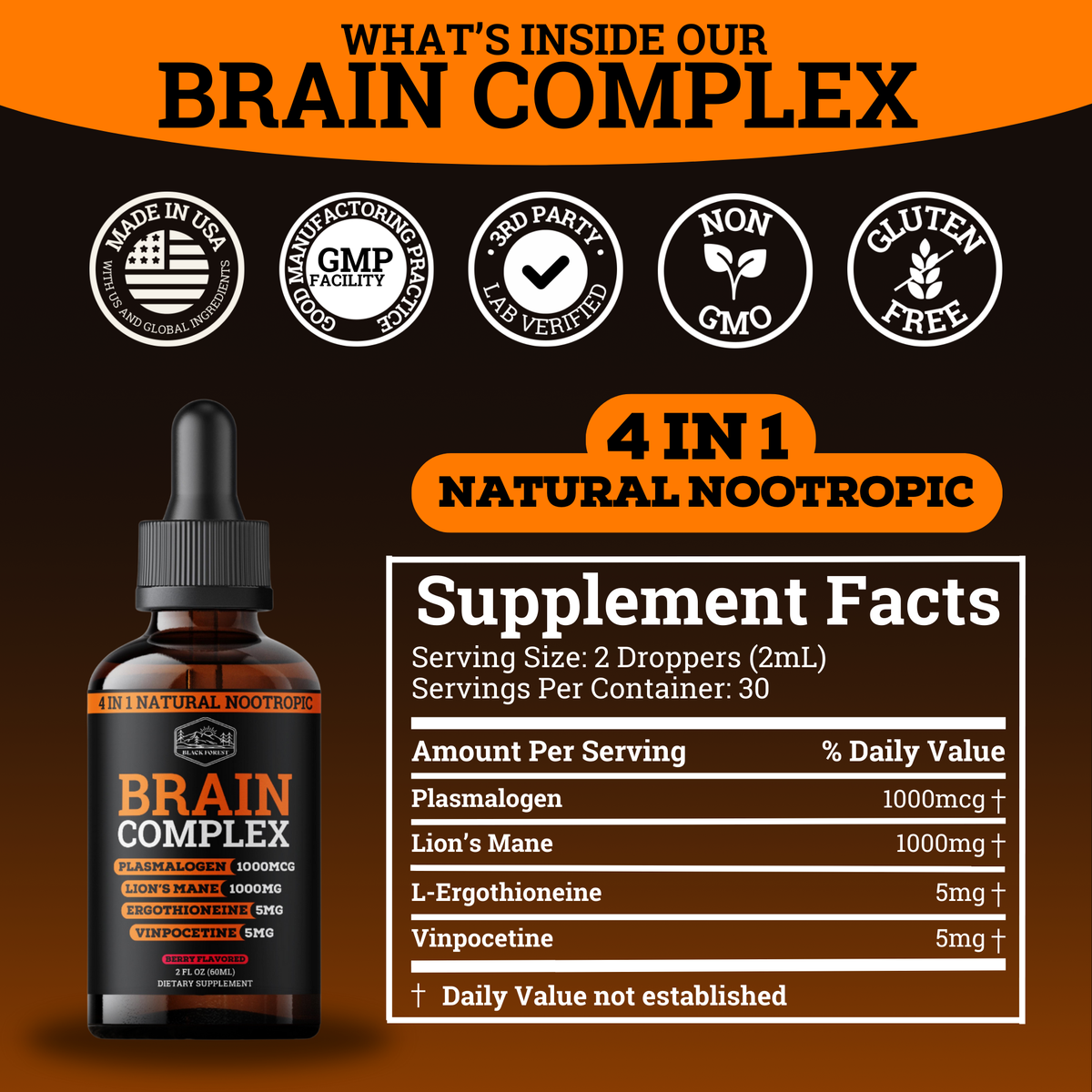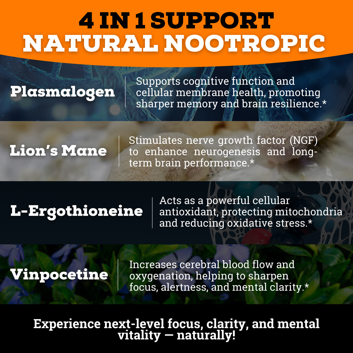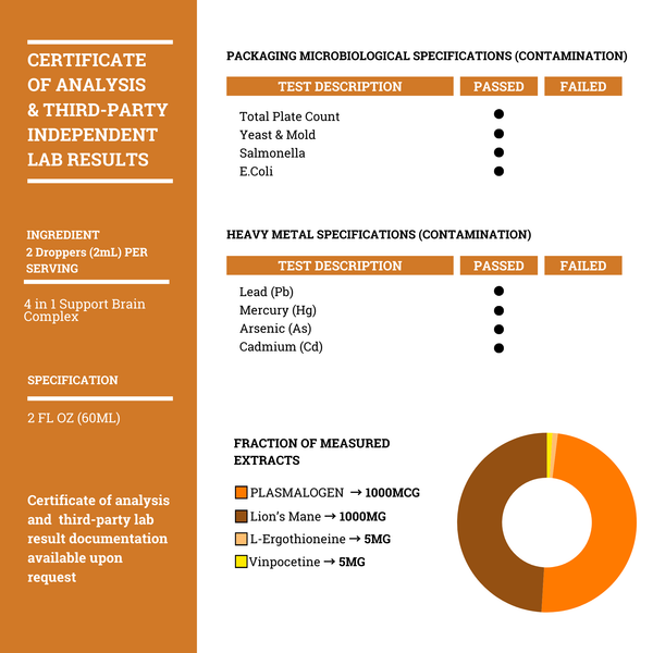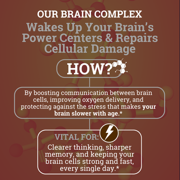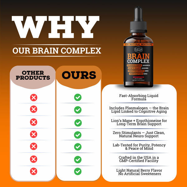 Reclaim your mind with Brain Complex, a 4-in-1 synergistic blend of scientifically proven ingredients including Plasmalogen, Lion’s Mane, L-ergothioneine, and Vinpocetine. This cutting-edge formula supports focus*, memory,* brain fog*, and long-term cognitive health*—crafted by our experts to outsmart Big Pharma’s addictive crutches with natural, lasting power.
