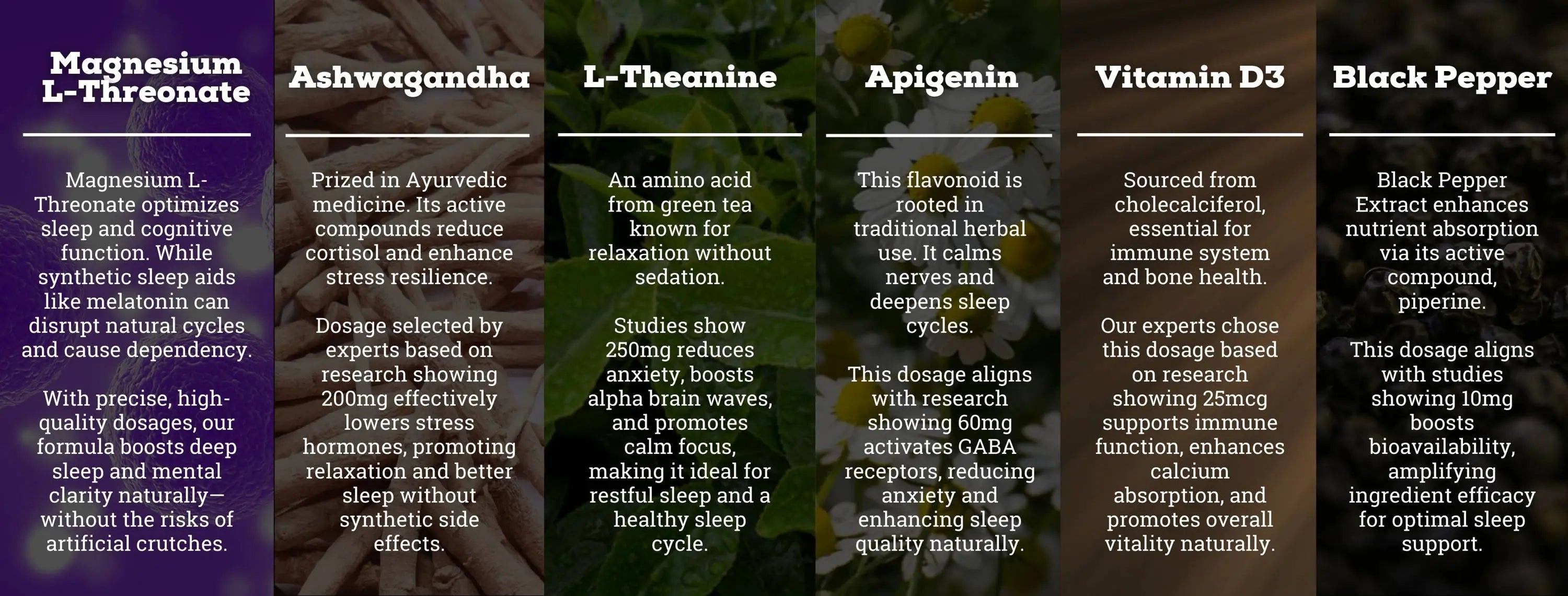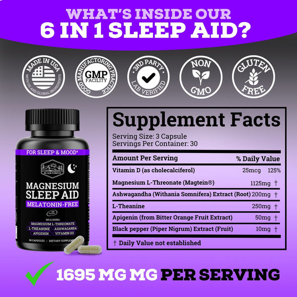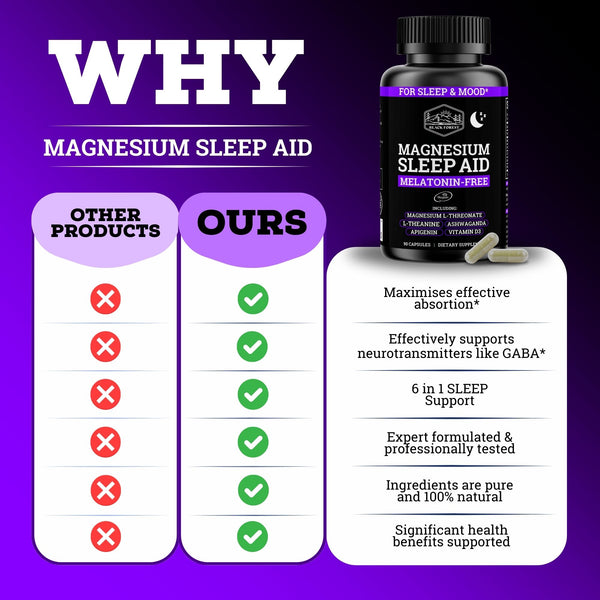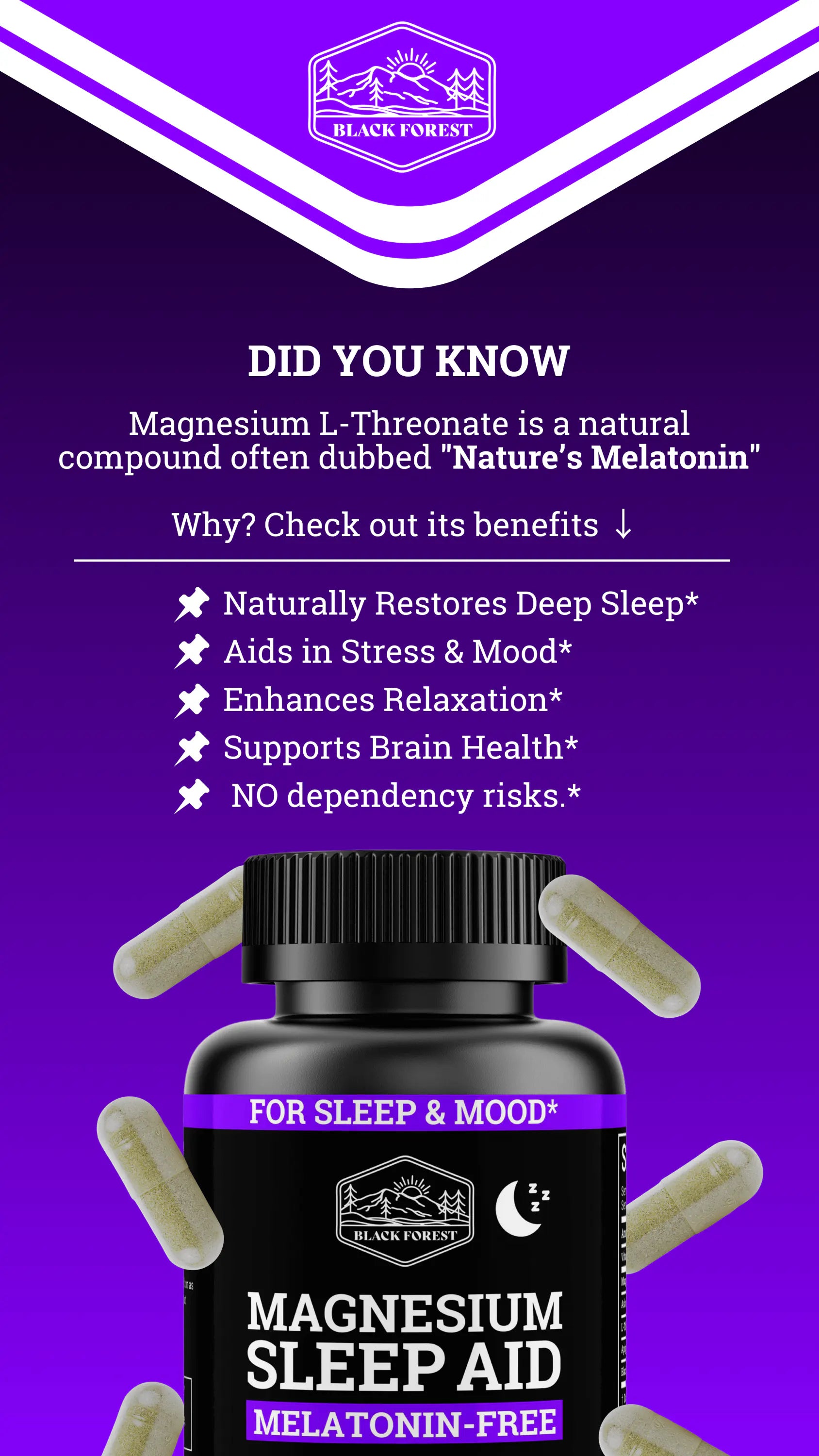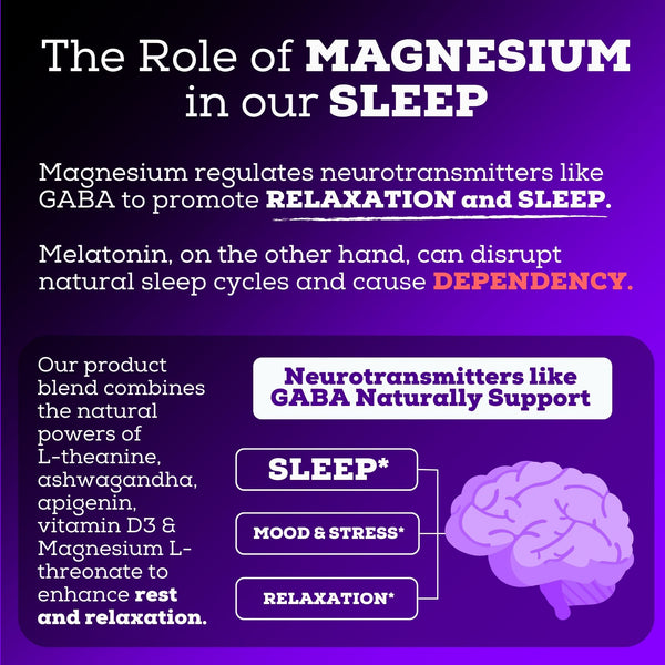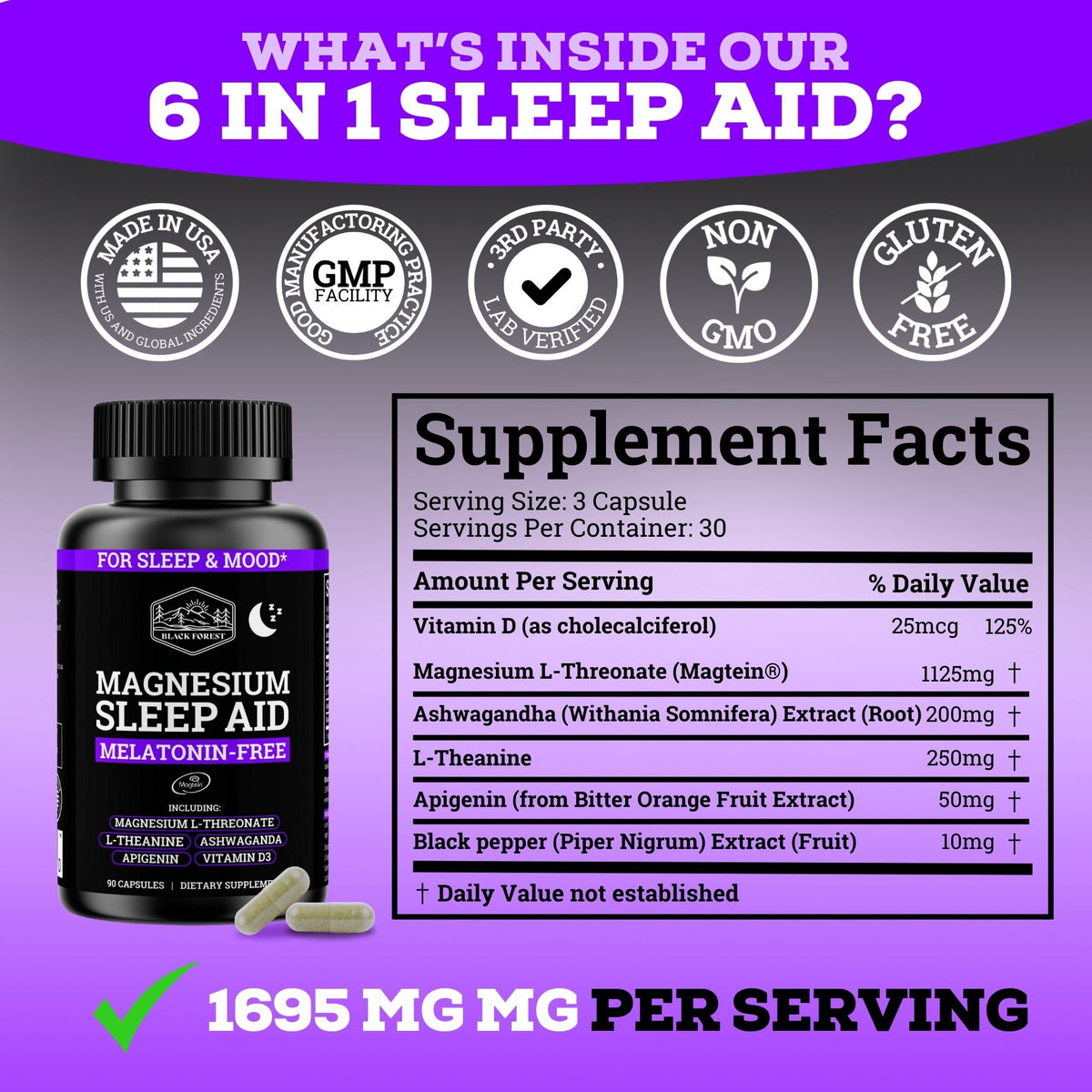 Restore your sleep with our Magnesium Sleep Aid, a 6-in-1 synergistic blend of scientifically proven ingredients like Magnesium L-Threonate, Ashwagandha, L-Theanine, Apigenin, and Black Pepper Extract. This advanced formula promotes deep sleep, reduces stress, enhances relaxation, and supports brain health—crafted by experts for lasting, natural results.