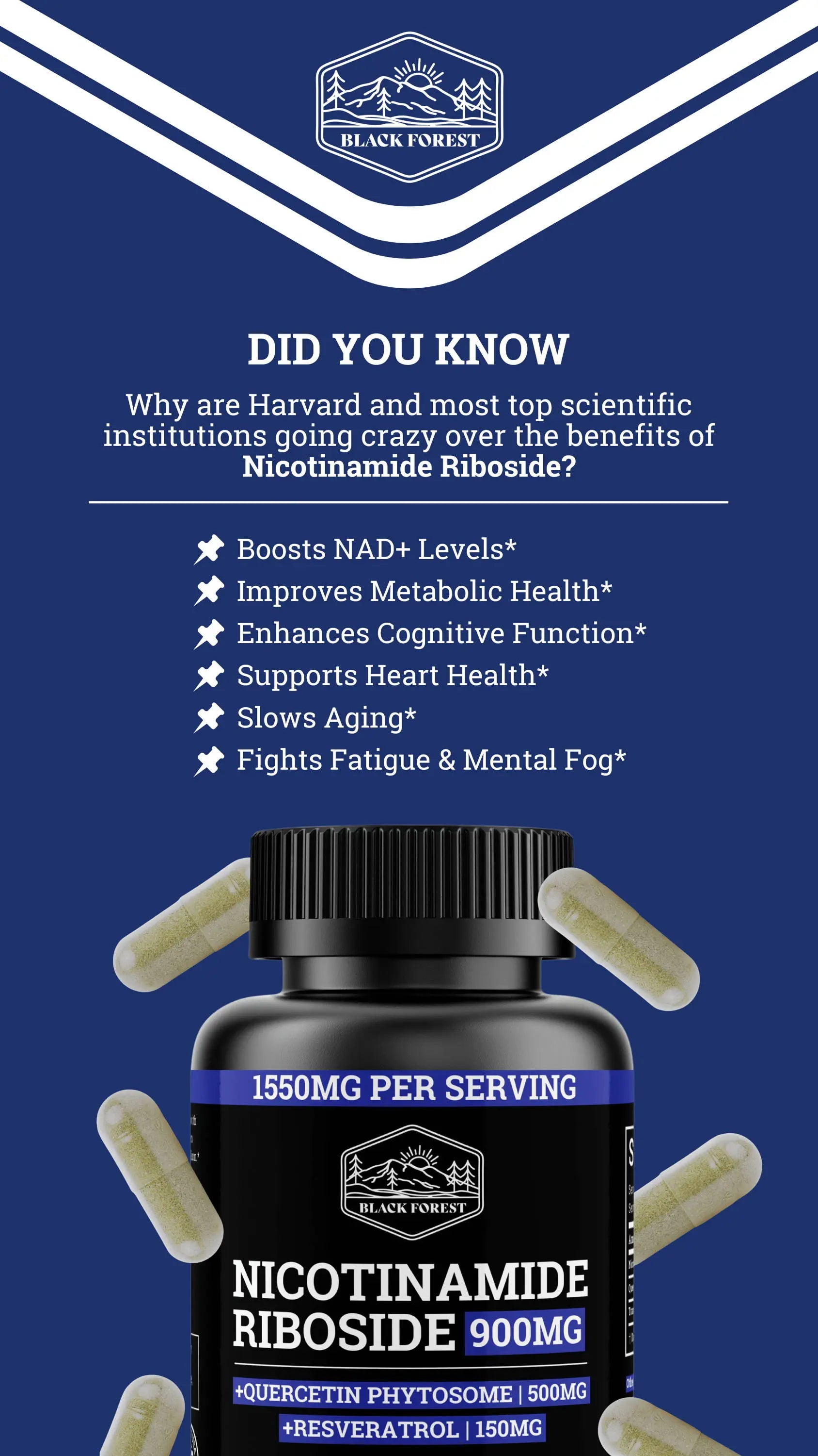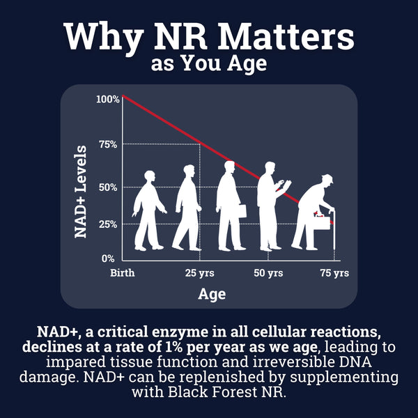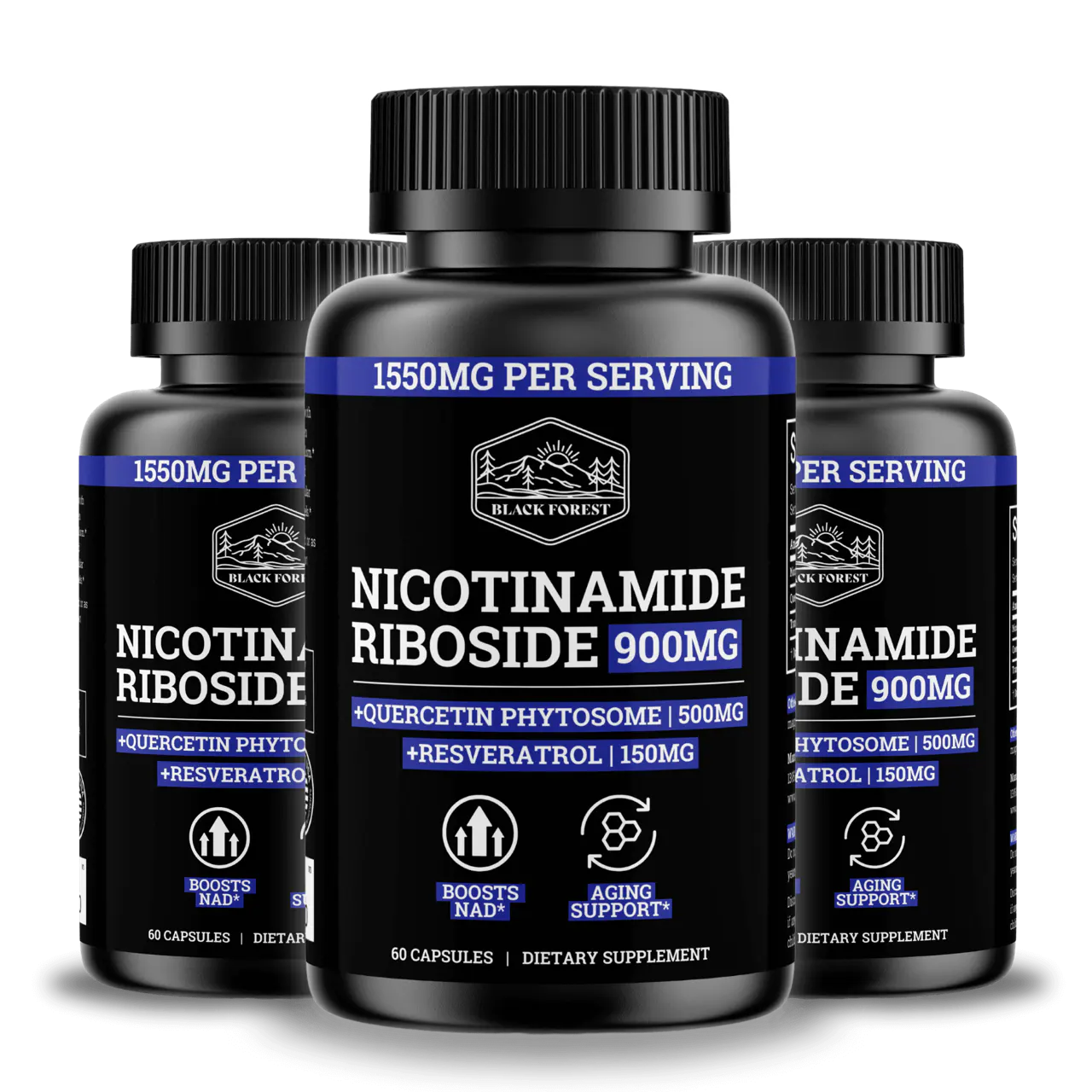 Black Forest’s Nicotinamide Riboside (NR) delivers 900mg of clinically tested NR, rapidly increasing NAD+ levels to enhance energy, brain function, and metabolic health. Paired with Quercetin Phytosome and Resveratrol, this powerful formula optimizes cellular repair*, supports healthy aging*, and boosts resilience against chronic diseases. Achieve vitality and long-term health with our premium NAD+ booster.*