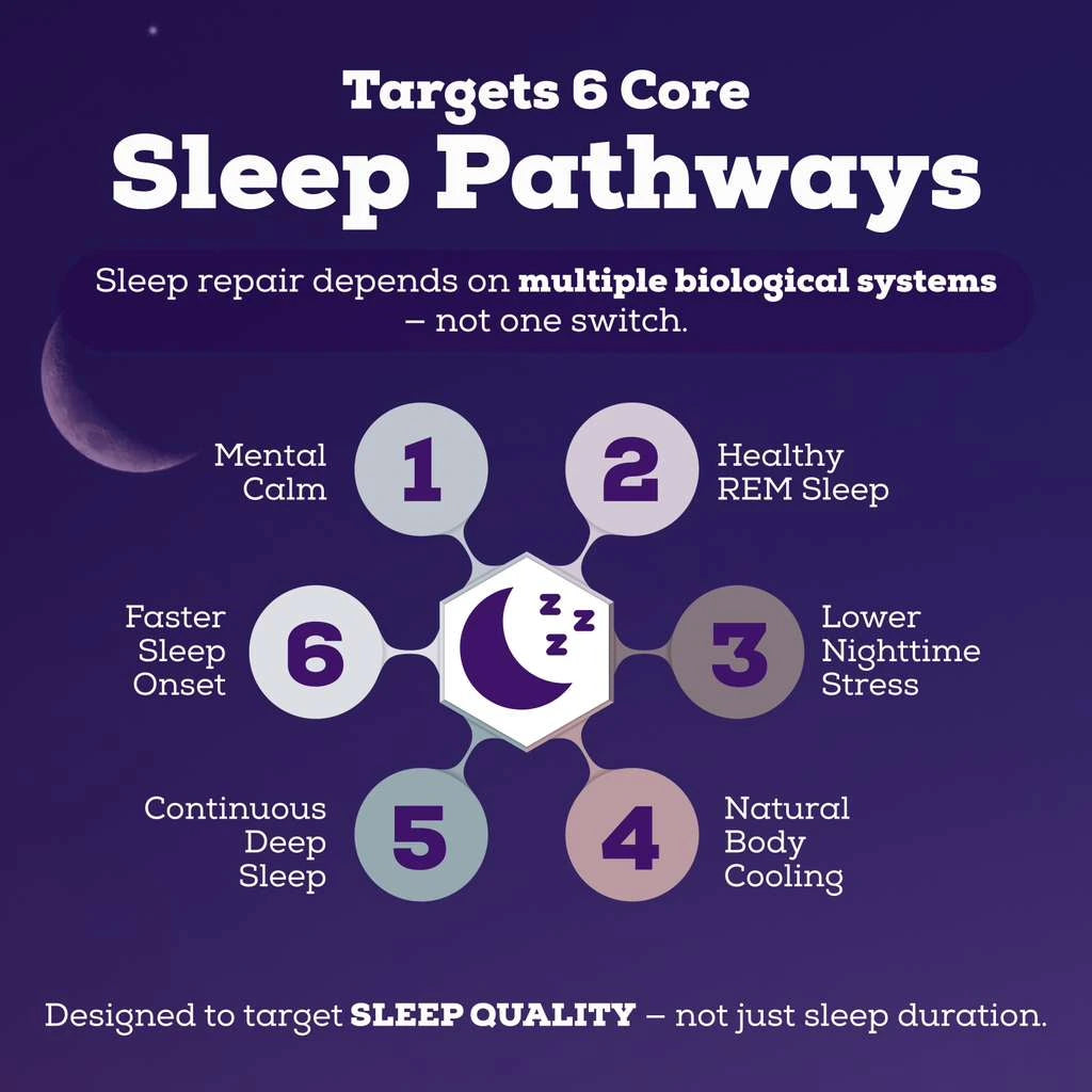 It supports sleep initiation without grogginess, tolerance, or dependency, allowing the body to focus on real overnight repair.